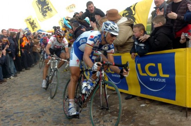 Tom Boonen (Quick Step) has won Paris-Roubaix for the second time. Boonen dusted Fabian Cancellara (CSC) and Alessandro Ballan (Lampre) to win the Hell of the North in 5:58:42. Cancellara and Ballan finished second and third, respectively, at 0:01.