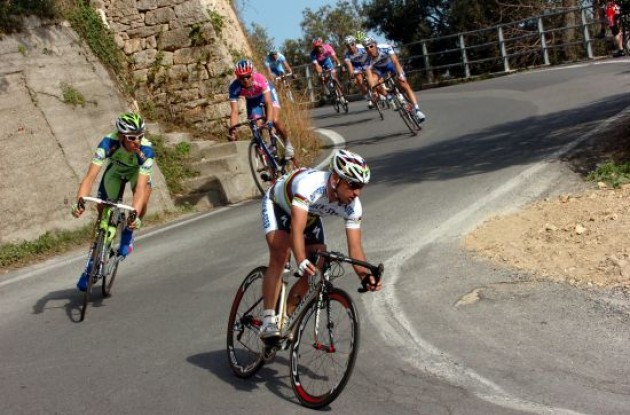 Team CSC riders Kroon and Schleck helped close the initial gaps and later several other Team CSC members were up front between the Cipressa and the Poggio pulling the peloton to set a high pace. When a dangerous group started forming on Poggio Cancellara escaped from the peloton and bridged up to a front group containing Davide Rebellin (Gerolsteiner), World Champion Paolo Bettini (Quick Step) and Oscar Freire (Rabobank) amongst others.