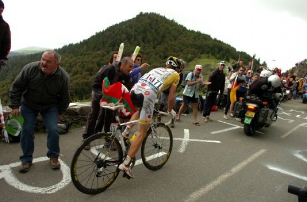 Jalabert was dropped. Behind, Schumacher and then Ricco attacked. Other riders followed suit, and the peloton disintegrated under the pressure, with the maillot jaune group containing all of the favorites. Caisse d'Epargne led the group.