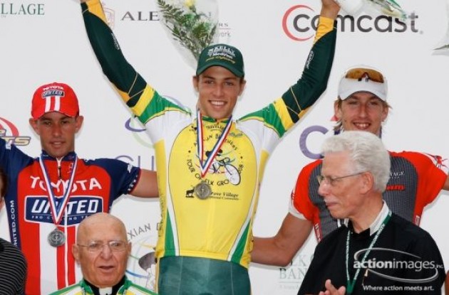 A break of six, including Tyler Hamilton (Team Rock Racing), developed immediately, gaining one minute. The boys rode it back to 25 seconds and then kept a break matching time for the next 2 hours and 20 minutes. With two to go they brought the break back and a few teams attempted to lead it out, but Team Kelly Benefits Strategies took control on the last lap and gapped Dominique Rollin and Hilton Clarke in the last corner. Brad Huff (Jelly Belly Pro Cycling) won Sunday's race. Veilleux took 2nd place and the 12 second time bonus and thus, a 10 second win in the final overall rankings over Hilton. Zirbel was able to finish in the group and hold on to his 3rd place on GC. Rock Racing’s Fred Rodriguez' memory of a couple of hard falls earlier this season as well as Team Keyy's way of riding in corners made him opt for a cautious approach in the final stage as the Kelly Benefit-Medifast team again led out the sprint. He finished third in the criterium to place fifth overall. Team Astana's Chris Horner crashed in the final stage but was able to finish the race.
