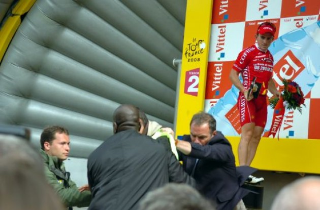 Just when all the excitement dies down, an uninformed thug is on the podium! He is subdued but I wonder where was security? I’ve just been informed the security company is the same one used at the French Drug testing lab. I’m just happy no podium girls were hurt. Sadly, Angel Gomez who crashed hard is out. Soler finishes.