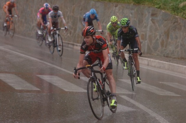 Enrico Battaglin (Bardiani Valvole-CSF Inox) took the sprint for second from Danilo Di Luca (Vini Fantini-Selle Italia) at 1:07. Benat Intxausti (Movistar) is the new maglia rosa.