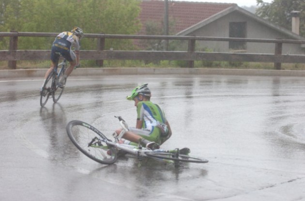 On the descent, Vincenzo Nibali (Astana) crashed. He remounted quickly and got back on. Sella crashed again, and the lead group caught him. Bradley Wiggins (Sky), who had already been dropped, crashed on the descent. He would lose more than a minute to his rivals. Paolini was dropped and Intxausti would take his jersey. Hansen would cruise to victory in the rain.